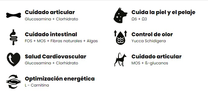 Carne deshidratada 38 % (cerdo ibérico 14 %), arroz 27 % (arroz integral 15 %), guisantes 12 %, grasa de ave 12 %, harina de algarroba 2 %, pulpa de remolacha 2 %, proteína animal hidrolizada, vitaminas y minerales, levadura y extracto de levadura - saccharomyces cerevisiae (fuente de mananooligosacáridos – MOS y ? - glucanos), aceite de salmón (fuente de ácidos grasos omega-3), fibra dietética insoluble de guisante, Inulina (fibra soluble de achicoria, fuente fosfooligosacáridos - FOS), salvia hispánica (fuente de ácidos grasos omega-3 y fibra dietética), algas (ascophyllum nodosum), hidrolizado de crustáceos (fuente de glucosamina), hidrolizado de cartílago (fuente de condroitina), aceites esenciales (orégano, canela, clavo, tomillo, romero, hierbabuena, té verde) y yucca.