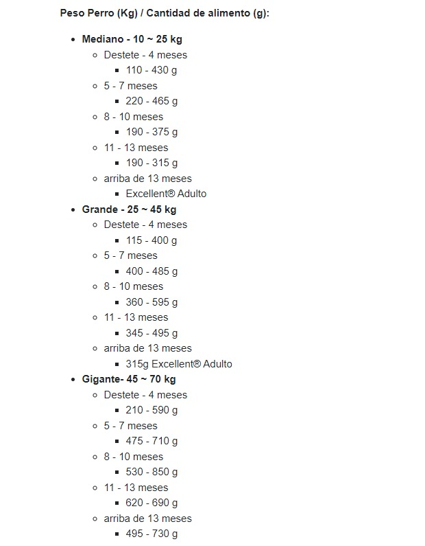 HEMBRAS LACTANTES: A lo largo de toda la lactancia, suministrar PURINA® EXCELLENT® Puppy Razas Medianas y Grandes con Pollo y Arroz de 2 a 4 veces la cantidad de PURINA® EXCELLENT® Adult Razas Medianas y Grandes con Pollo y Arroz que consumía antes de la gestación. En caso necesario, divida la cantidad recomendada a lo largo del día y ajústela para mantener una buena condición física.
